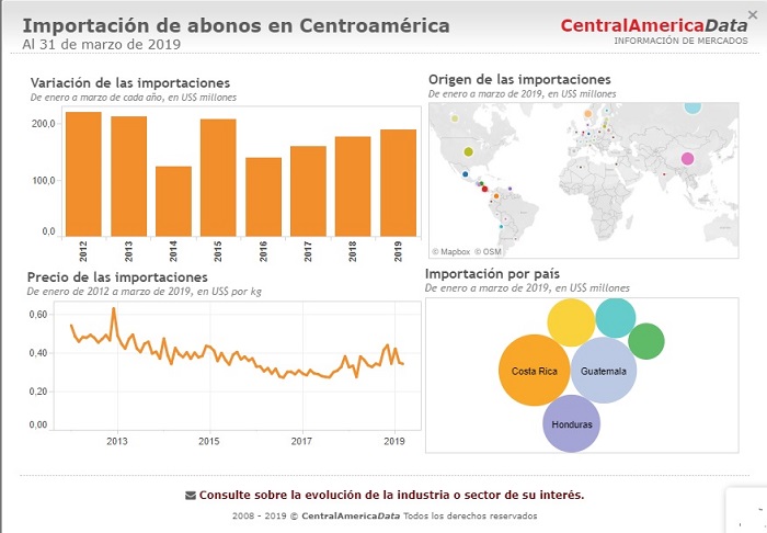 En los primeros tres meses de 2019 el principal importador de abonos en Centroamérica fue Costa Rica con $54 millones, seguido de Guatemala, con $46 millones, Honduras, con $35 millones, El Salvador con $24 millones, Panamá con $17 millones y Nicaragua, con $14 millones.