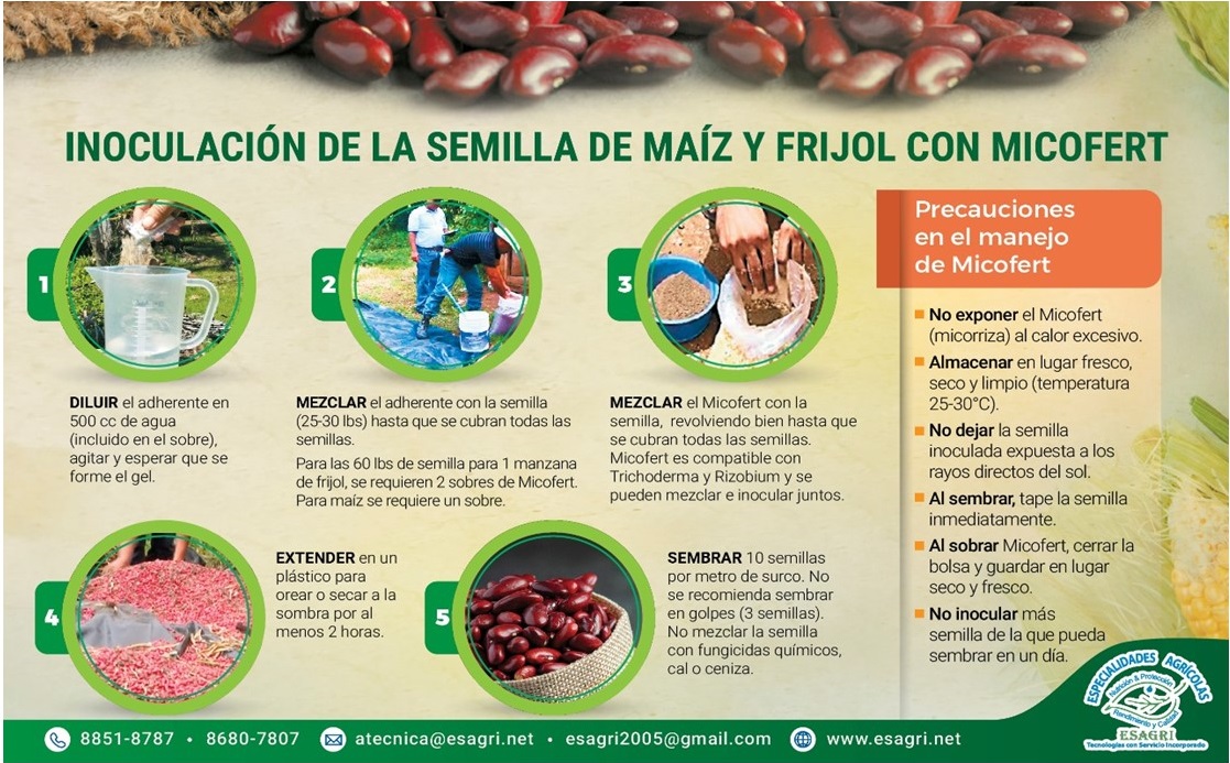 Hay que tratar directamente la semilla con MICOFERT. En cultivos anuales con tamaño de semilla mediano como maíz y sorgo se adhiere una bolsa de 500 gramos a la semilla utilizada para sembrar una manzana. En frijol se aplica 2 bolsas de 500 gramos a la semilla (60 lbs) utilizada para sembrar una manzana. En arroz se aplica 3-4 bolsas a la cantidad de semilla para sembrar una manzana.