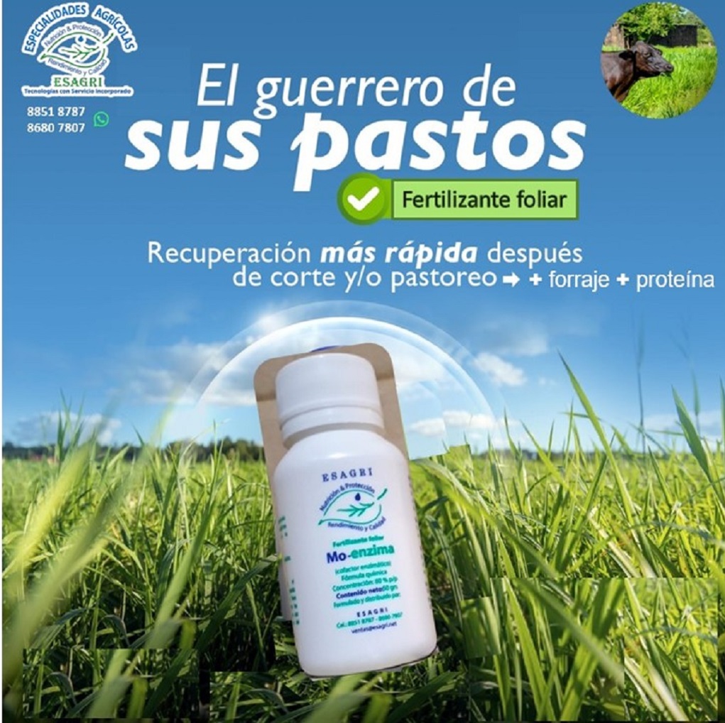 Mo-Enzima estimula el crecimiento y la calidad del pasto, logrando mayor producción de forraje por manzana, con más proteína, mejor digestibilidad y menor acumulación de nitratos. Su acción enzimática mejora el aprovechamiento de nutrientes, acelera el rebrote y fortalece el sistema radicular, garantizando pastoreos más uniformes y productivos, tanto en sistemas tradicionales como intensivos.